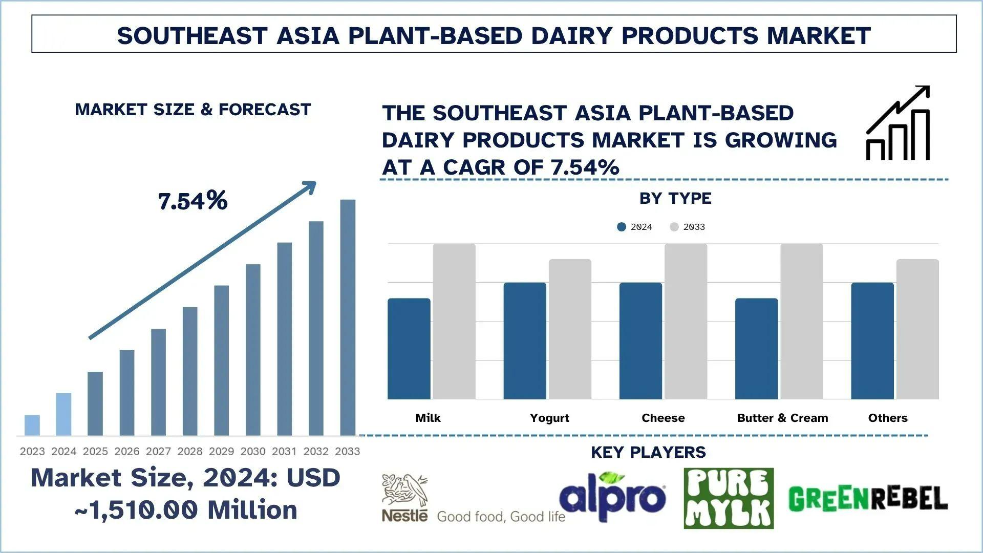 According to the UnivDatos, rising lactose intolerance and dairy allergies, increasing vegan and flexitarian lifestyles, expanding retail and e-commerce penetration, product innovation and flavor expansion, rising urbanization and health-conscious consumers, digital marketing and social media influence drive the Southeast Asia Plant-Based Dairy Products market. As per the “Southeast Asia Plant-Based Dairy Products Market” report, the market was valued at ~USD 1,510.00 million in 2024, growing at a CAGR of about 7.54% during the forecast period from 2025 to 2033 to reach USD million by 2033.
