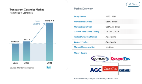 The global Transparent Ceramics Market is witnessing remarkable growth, with the market valued at USD 890 million in 2025 and expected to expand from USD 1 billion in 2026 to reach USD 1.79 billion by 2031, at a CAGR of 12.36%. The market is gaining traction due to the increasing demand for high-performance optics, advanced aerospace components, and consumer electronics that require durable, scratch-resistant, and thermally stable materials.